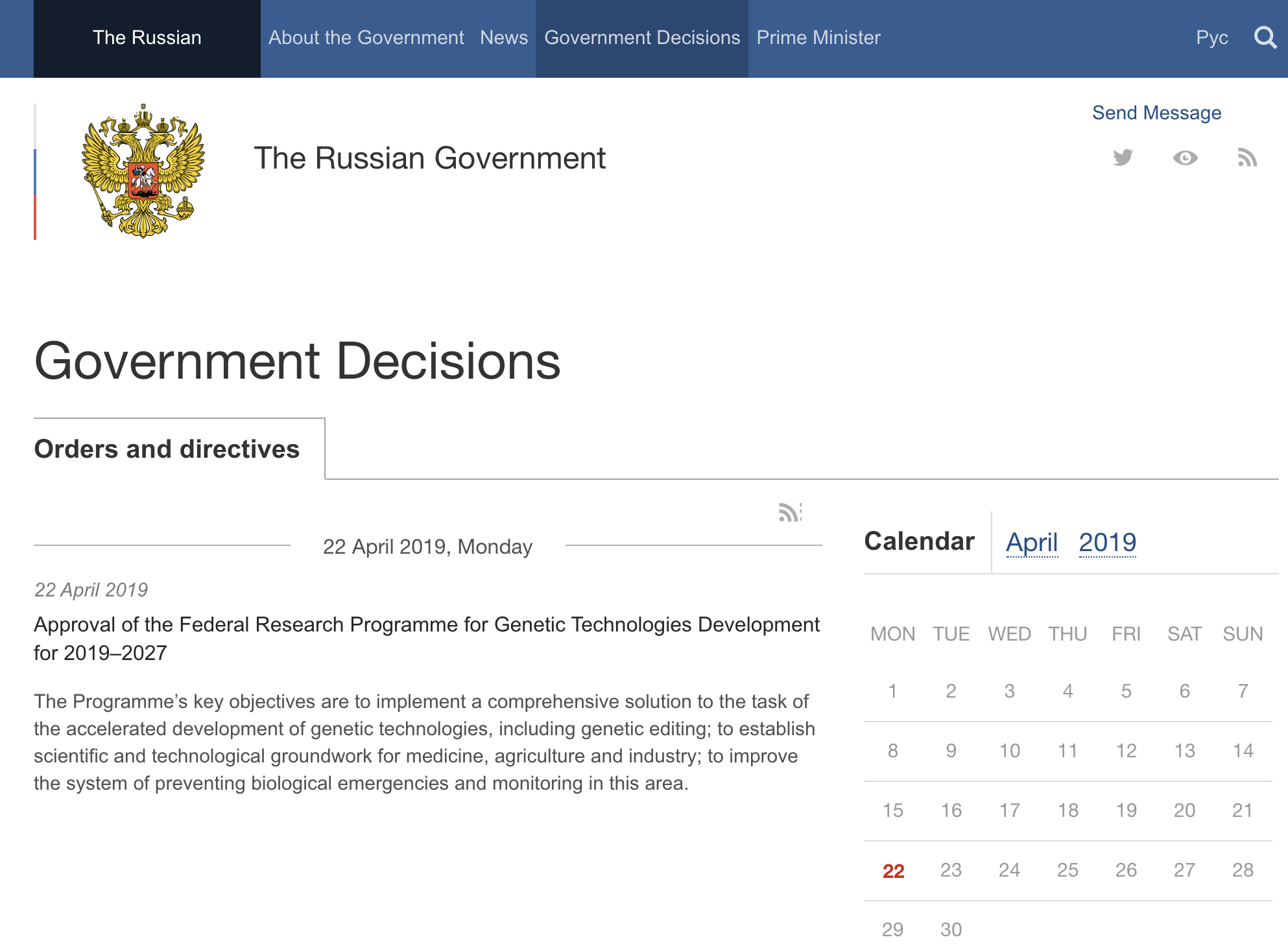 “The Program’s key objectives are to implement a comprehensive solution to the task of the accelerated development of genetic technologies, including genetic editing; to establish scientific and technological groundwork for medicine, agriculture and industry; to improve the system of preventing biological emergencies and monitoring in this area.”