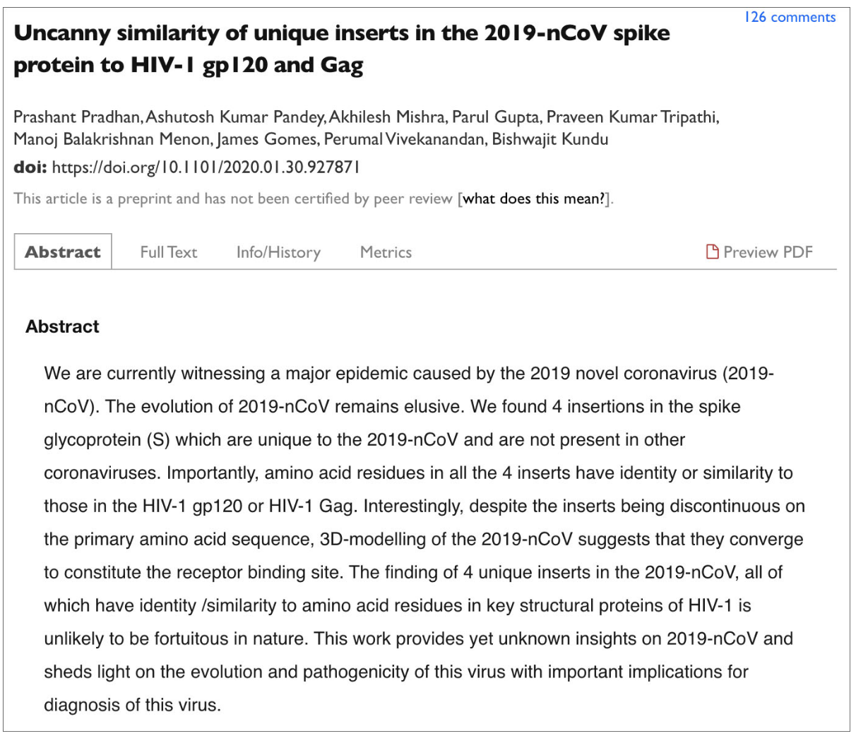 In “Uncanny similarity of unique inserts in the 2019-nCoV spike protein to HIV-1 gp120 and Gag“, Indian researchers are baffled by segments of the virus’s RNA that have no relation to other coronaviruses like SARS, and instead appear to be closer to HIV. The virus even responds to treatment by HIV medications.